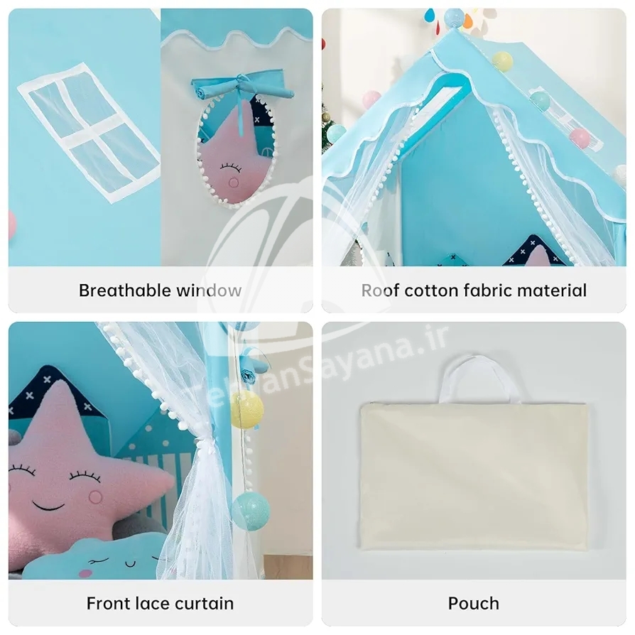 دارای اسکلت پلی اتیلن لوله ای بدون حساسیت با ساختار داربستی و پارچه پلی استر مخصوص چادرهای بازی کودک .